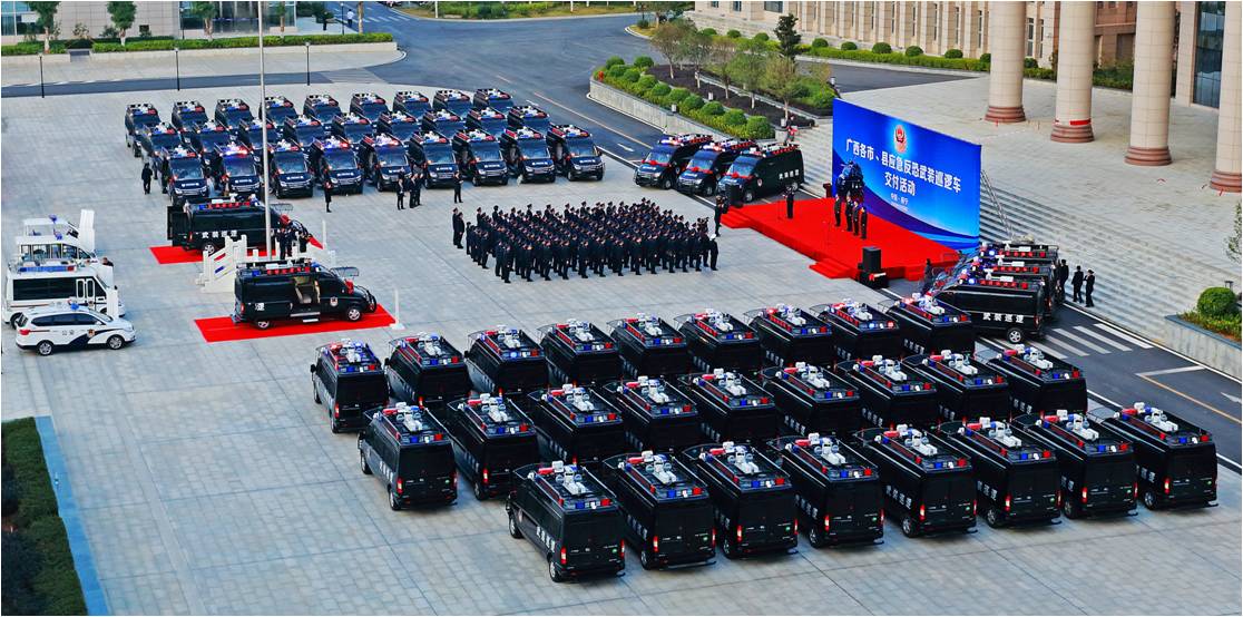 這批反恐武裝巡邏車是公司根據(jù)廣西全區(qū)反恐實(shí)戰(zhàn)需求和區(qū)域特點(diǎn),研發(fā)生產(chǎn)的全新一代五菱V80特種專用警務(wù)產(chǎn)品。每輛應(yīng)急反恐武裝巡邏車能滿足5-6個警員攜帶裝備執(zhí)行出警和應(yīng)急處突任務(wù),整車安裝有防護(hù)網(wǎng),前撞擊桿,后防護(hù)桿,可清除一般性障礙,撞擊作案車輛,具有強(qiáng)悍的防暴制暴和突擊能力及穩(wěn)固的自我防護(hù)能力等特點(diǎn)。同時,該車還配備有全方位星光級夜視車載智能監(jiān)控系統(tǒng)、升降式強(qiáng)光照明燈、公安網(wǎng)移動上網(wǎng)本及多形態(tài)電源供給系統(tǒng),可與各級公安監(jiān)控指揮中心實(shí)時聯(lián)絡(luò),即使在極端惡劣條件下,均可啟動全方位監(jiān)控及語音通訊功能,通過